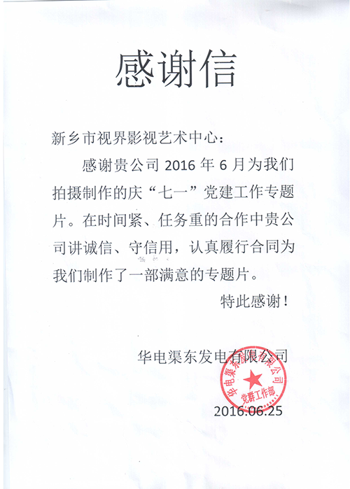 2016年先后收到中石化、華電集團(tuán)、南水北調(diào)工程等客戶的表揚信或感謝信。