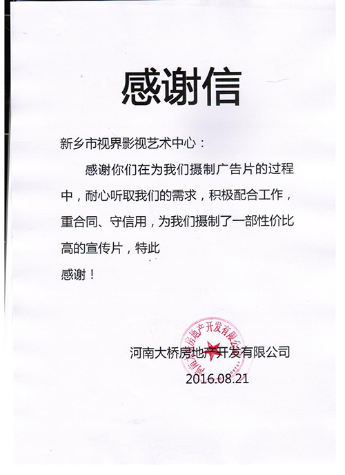 專業(yè)的影視團(tuán)隊,精湛的制作水平,合理的收費,貼心的服務(wù)使視界影視藝術(shù)中心業(yè)績輝煌:自2005年成立以來,已為新鄉(xiāng)市企業(yè)、房地產(chǎn)、行政、事業(yè)等單位制作了三百多部影視宣傳片,形成了著名良好口碑,回頭客不斷增加。新鄉(xiāng)市政府及各個局委,科隆集團(tuán)等著名大企業(yè),新鄉(xiāng)市一中、新鄉(xiāng)市人民醫(yī)院等著名事業(yè)單位、建業(yè)等各大房地產(chǎn)商都是視界影視的長期合作伙伴。