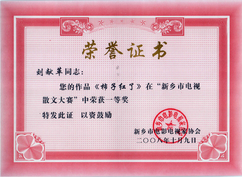 榮譽證書:電視散文《柿子紅了》獲一等獎