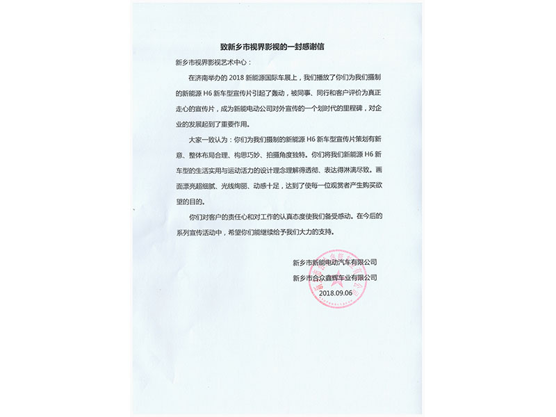 感謝信:來自新鄉(xiāng)市新能電動汽車有限公司