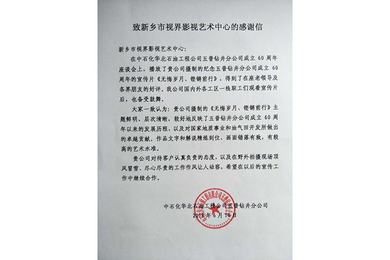 感謝信:來(lái)自中石化華北石油工程公司五普鉆井分公司