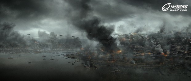 這個(gè)項(xiàng)目難度最大的就是這些全景純CG制作的鏡頭,本次電影里涉及到七八個(gè)這 樣的鏡頭。這些鏡頭需要復(fù)雜的工藝流程,比如重慶轟炸前后的全景鏡頭,從數(shù)字繪景、三維建模、骨 骼綁定、跟蹤、材質(zhì)貼圖、燈光匹配、動(dòng)畫效果、特殊力學(xué)效果到最終合成、調(diào)色等。像這種樣難度的 鏡頭的制作,對(duì)于全世界的特效公司來(lái)說(shuō),都不會(huì)輕松。
