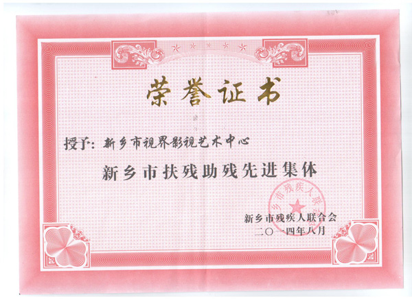 獲獎(jiǎng)?wù)f明: 2014年新鄉(xiāng)市殘聯(lián)授予視界影視“新鄉(xiāng)扶殘助殘先進(jìn)集體”榮 譽(yù)稱號(hào)